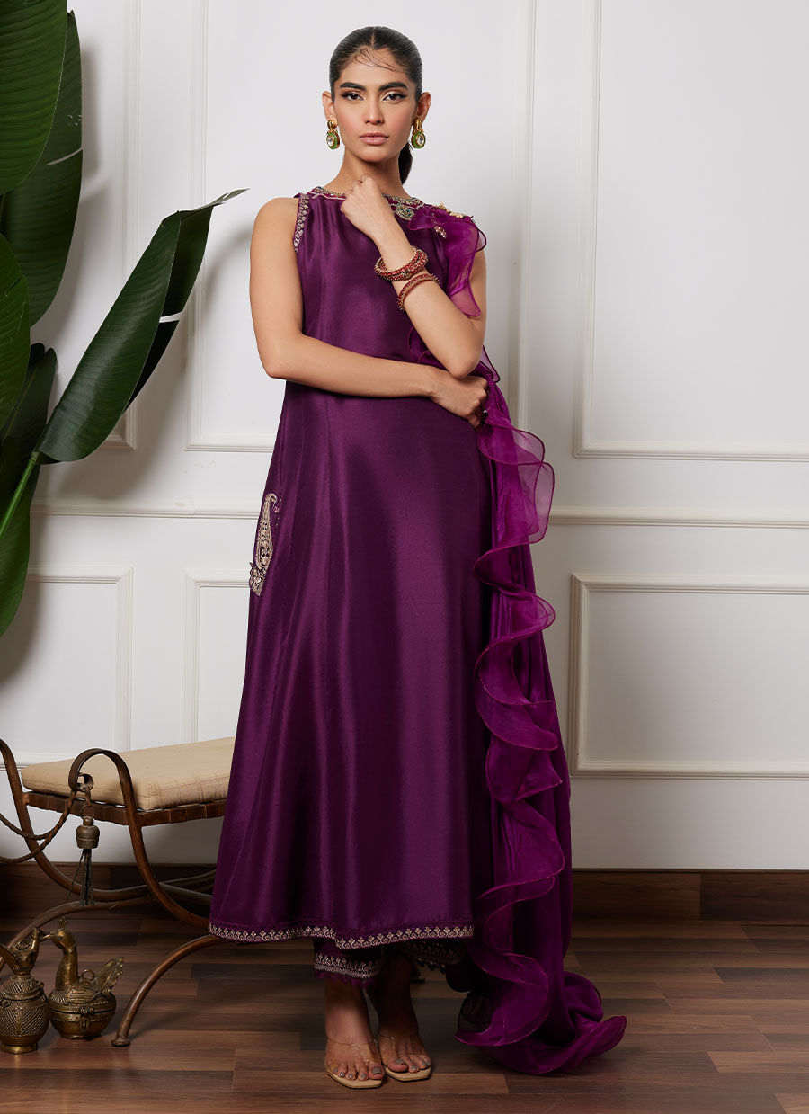 Cut from pure raw silk in a striking aubergine hue the impeccable tailoring and smooth flowing kalis of this ensemble will have you reaching for it whenever you really want to make an impact!