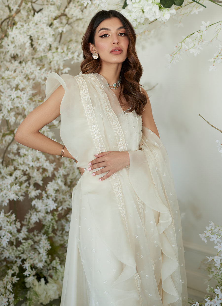 This dramatic, exquisitely flowing Saree dress, in a stunning shade of ivory, will have all eyes on you.