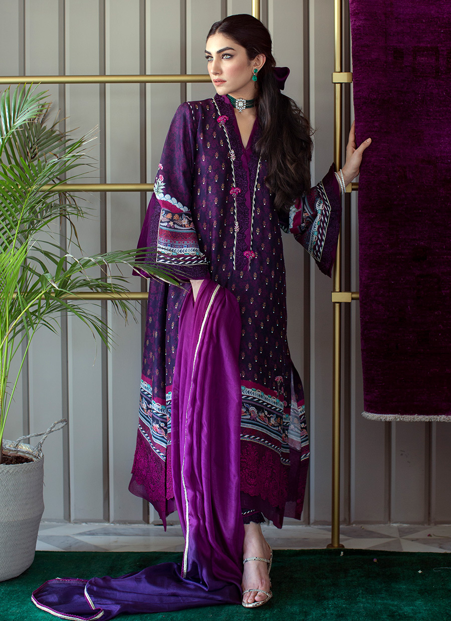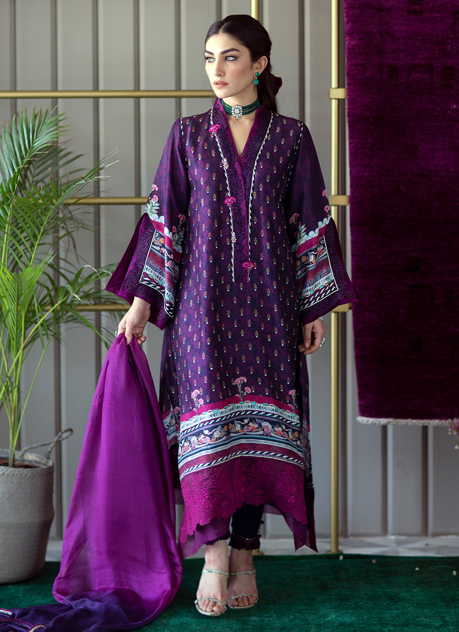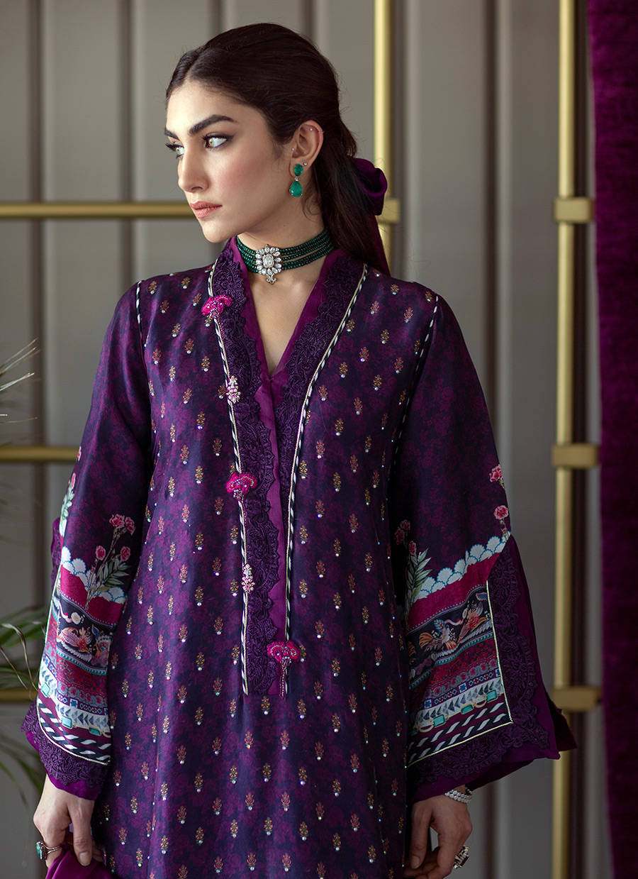 Designed in-house at the FTA Studio in Karachi, each of our printed tunics is created with extreme attention to detail. Cut from pure raw silk, this stunning tunic is doused in regal plum hues, which are offset with delicate pastel flowers blooming along the eye catching magenta borders.