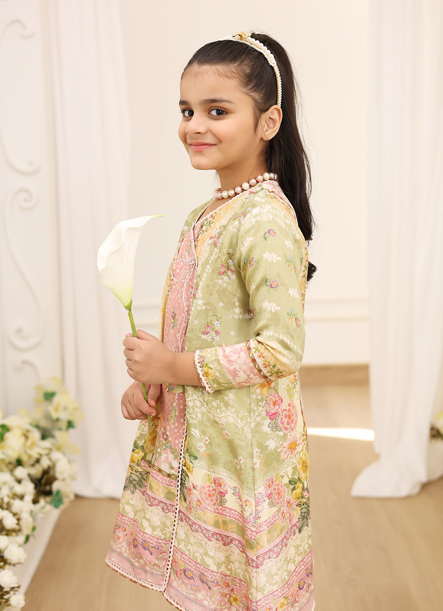 Irresistibly romantic florals, luxe fabrics and captivating details for the ultimate wardrobe reset!! This pale pink and light green floral printed raw silk angarkha for young girls is an enchanting fusion of tradition and playful elegance.The soft pastel hues of pale pink, ivory and light green are adorned with delicate floral prints, evoking a fresh, feminine charm perfect for festive occasions. The angarkha's distinctive design, with its overlapping front, creates a flattering silhouette while maintaining a youthful, spirited look. The intricate floral detailing enhances its beauty, making it an ideal choice for young girls who want to stand out with grace and elegance.