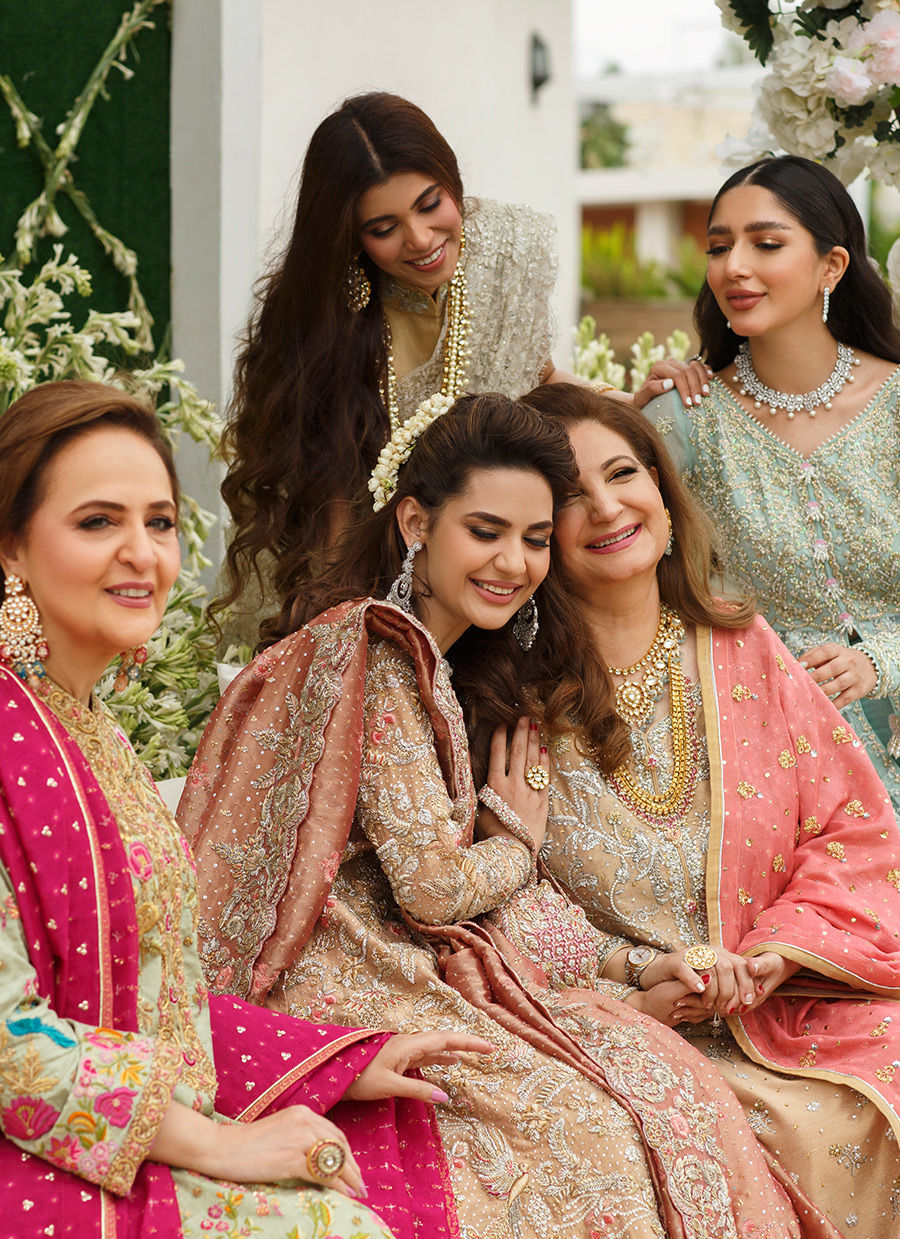 A meticulously picked rose gold zari net is emblazoned with intricate silver naqshi, silver kora dabka, silver and gold Swarovski crystals hand work which is sure to be a heritage bridal, sparkling flawlessly season after season.