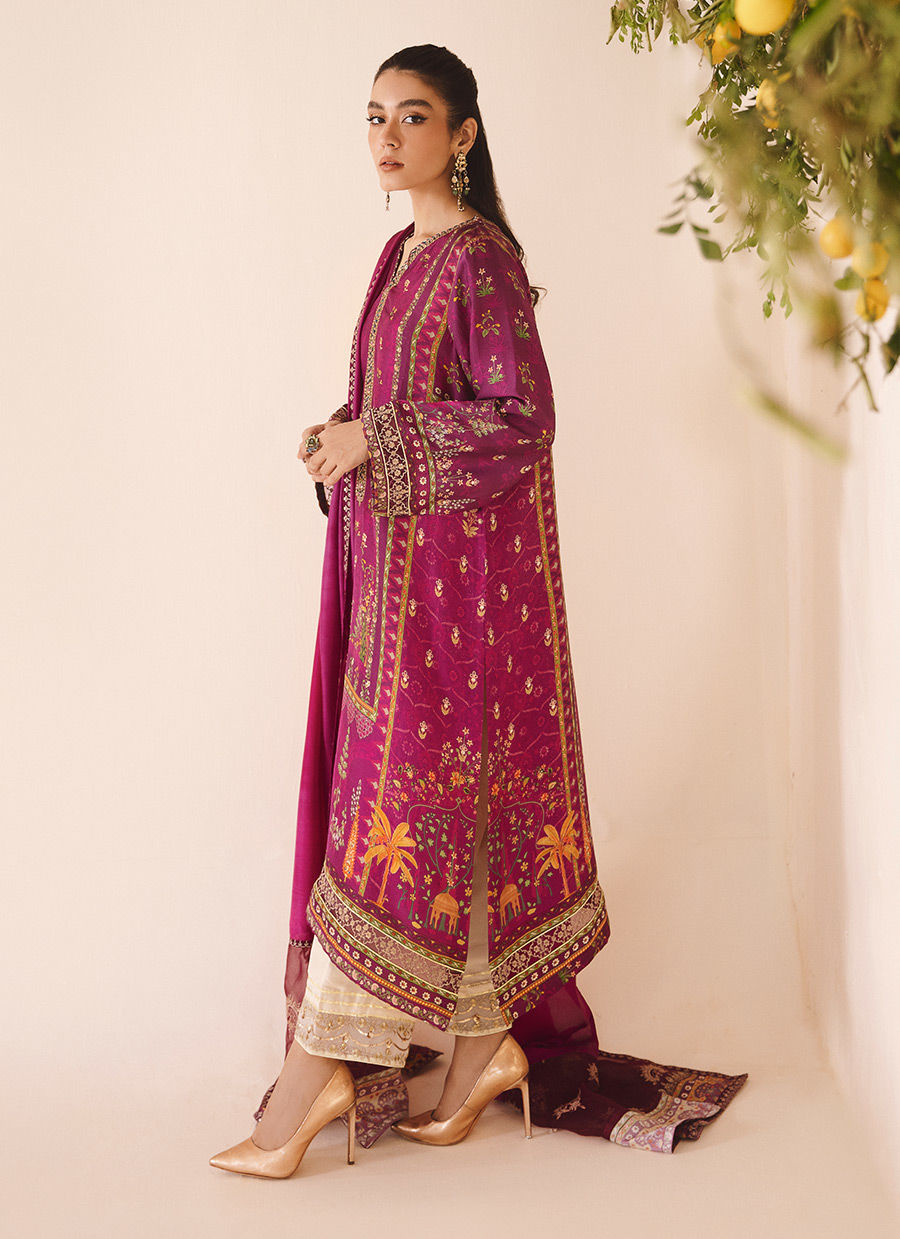 Color: Bright Plum Fabric: Raw Silk Work Details: Printed