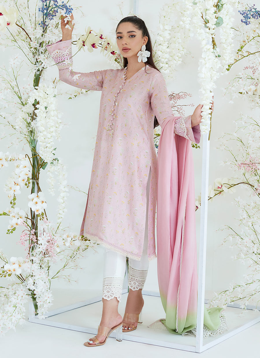 Cut from pure raw silk, the chai pink set is a refreshing, shade of pink printed with blissfully delicate florals. A universally flattering relaxed fit is made even more appealing with playful, statement sleeves with eyelet cutwork embroidery layered on the sleeve cuffs. The elegance detailing on the neckline and the pure medium silk dip dyed dupatta make this floaty, feminine set even more charming.