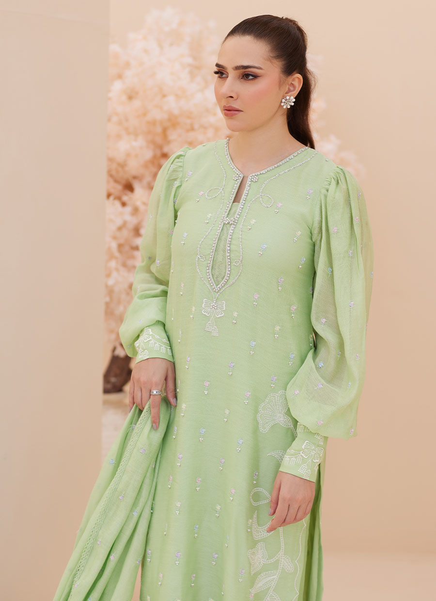 Beautifully crafted from a remarkably glamourous shade of pureapple green cotton net, the Serena ensemble strikes the perfect balance between elegant and eye-catching. This sleek, straight shirt is richly embroidered with intricate, silk threadwork, and further uplifted with silver and pearl hand embellishment on the neckline and the entire front of the shirt. Pastel florals bloom all along the front and sleeves of the shirt. Eye catching statement sleeves with embroidered and hand worked cuffs make it an elegant choice for any occasion. Paired with a pure cotton net in coordinating green, adorned with intricate pastel blooms and trimmed with delicate lace outfit gives a stunning flair. Complete your ensemble with the pure raw sick pants with embroidered borders as shown. Style yours with strappy flats and statement earrings for a timeless, glam look.