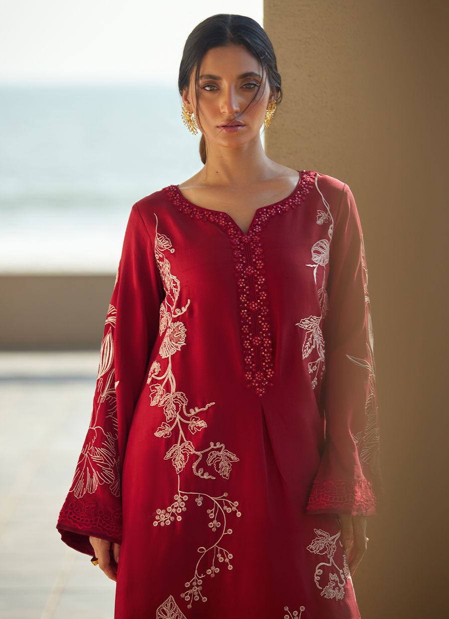 Bold and captivating, this deep scarlett, raw silk kaftan is intricately embroidered with ivory blooms and features a hand-embellished neckline for a touch of refined sparkle. The appliquéd schiffli border adds structure and sophistication, completing a look that is effortlessly striking and timelessly elegant.