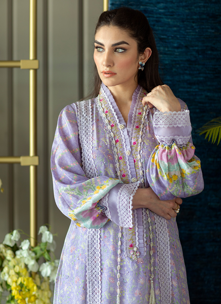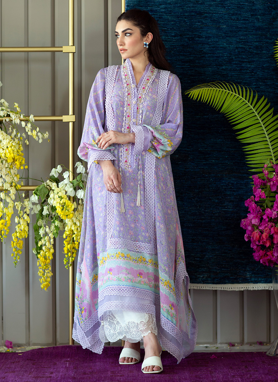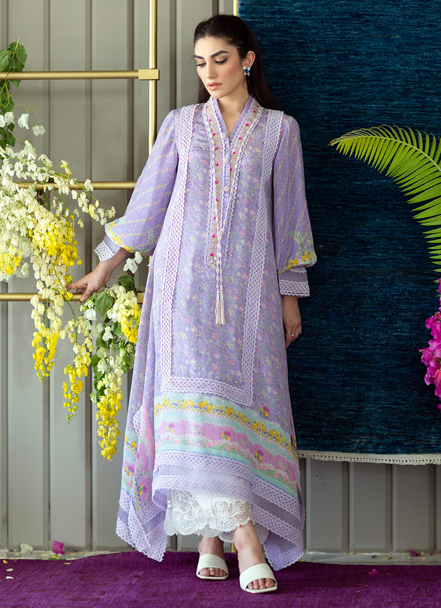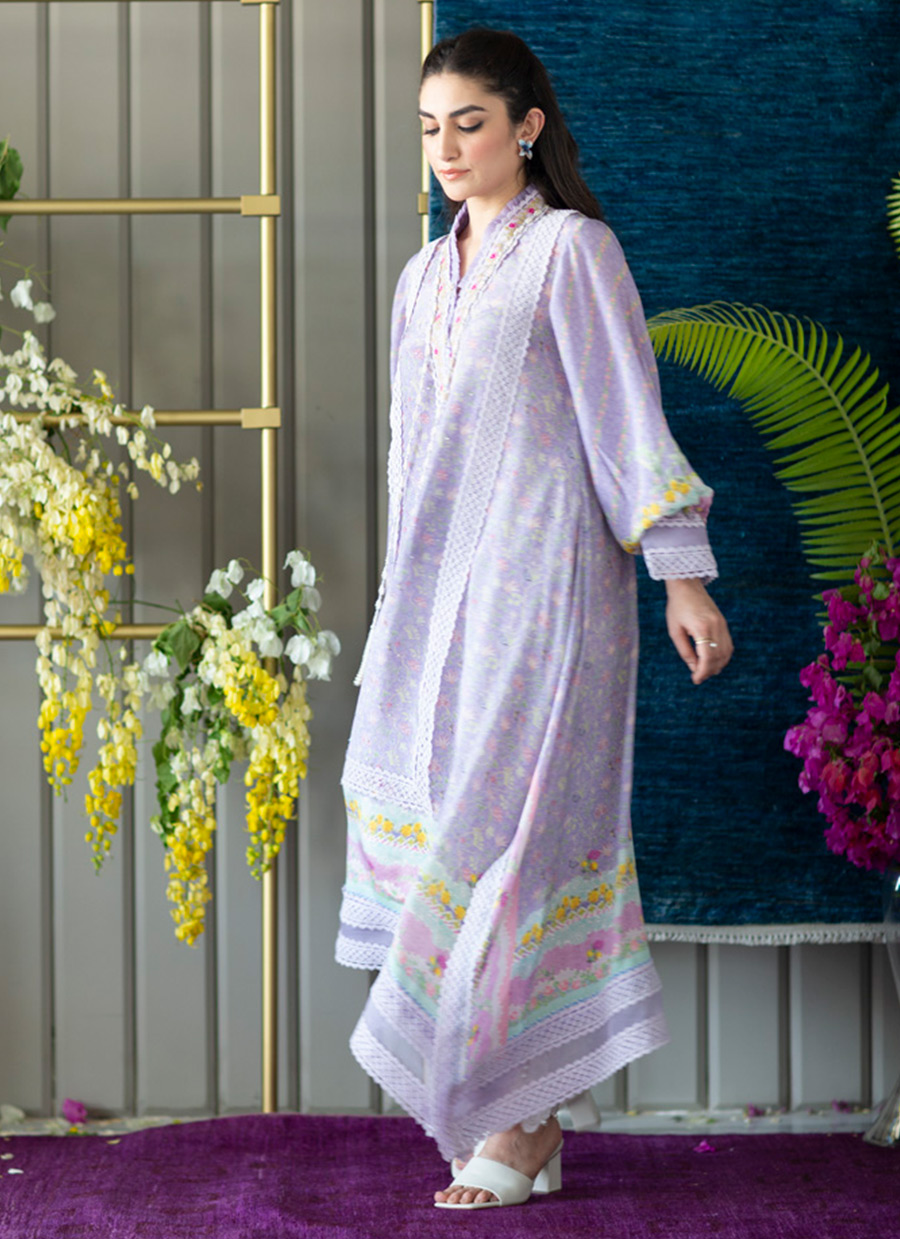 Designed in-house at the FTA Studio in Karachi, each of our printed tunics is created with extreme attention to detail. Cut from crepe silk, this romantic, lilac tunic is adorned with delicate pastel flowers as well as pretty cross stitch flowers blooming along the neckline. A breezy, silhouette with an abundance of that irresistible signature FTA detailing, is further enhanced by a statement chiffon statement sleeve with an intricate lace cuff. All you need this festive season are some unexpected details, pure, luxe fabrics and the ultimate, cool pastel tones!!
