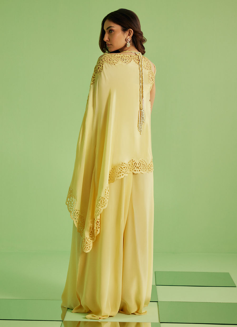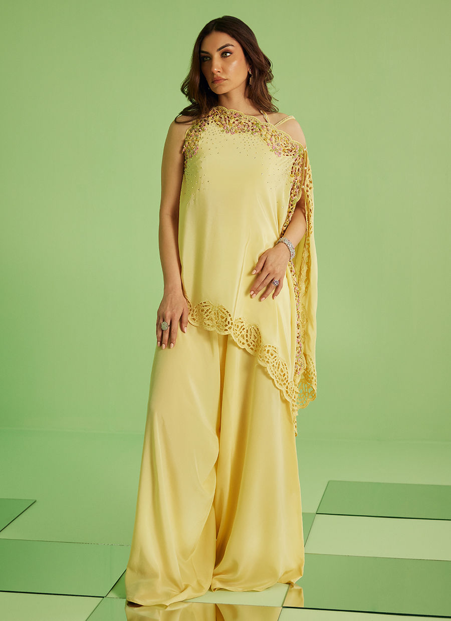 This ethereal ensemble features a flowing silhouette in delicate pastel yellow, designed to drape with fluid elegance. The look is elevated with a beautifully hand-embellished neckline, adorned with intricate detailing that adds a subtle shimmer and artisanal charm.