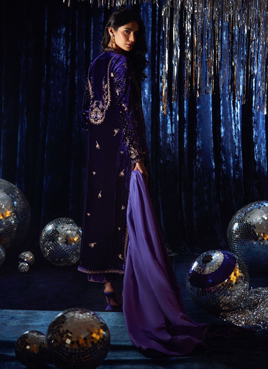A regal masterpiece in deep purple — this velvet overlap style shirt, exudes timeless allure with its extensive zari and zardozi handwork, meticulously crafted to perfection. The richly detailed embroidery enhances the luxurious texture of the velvet, creating a statement look steeped in tradition yet undeniably modern. Paired with coordinating purple izaar pants and a dip-dyed dupatta finished with a delicate zari border, this ensemble radiates graceful sophistication and festive grandeur.