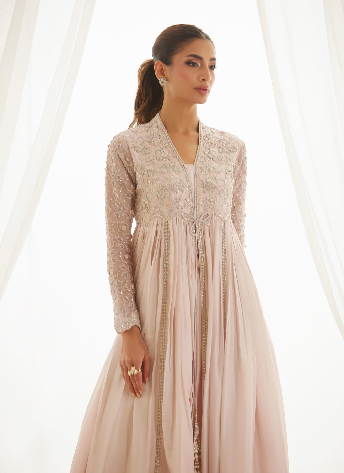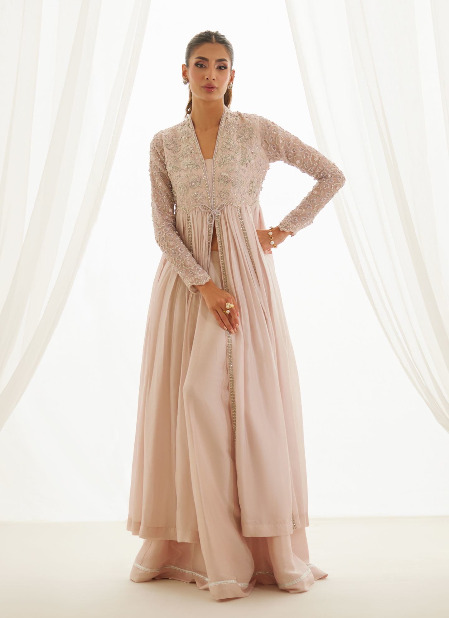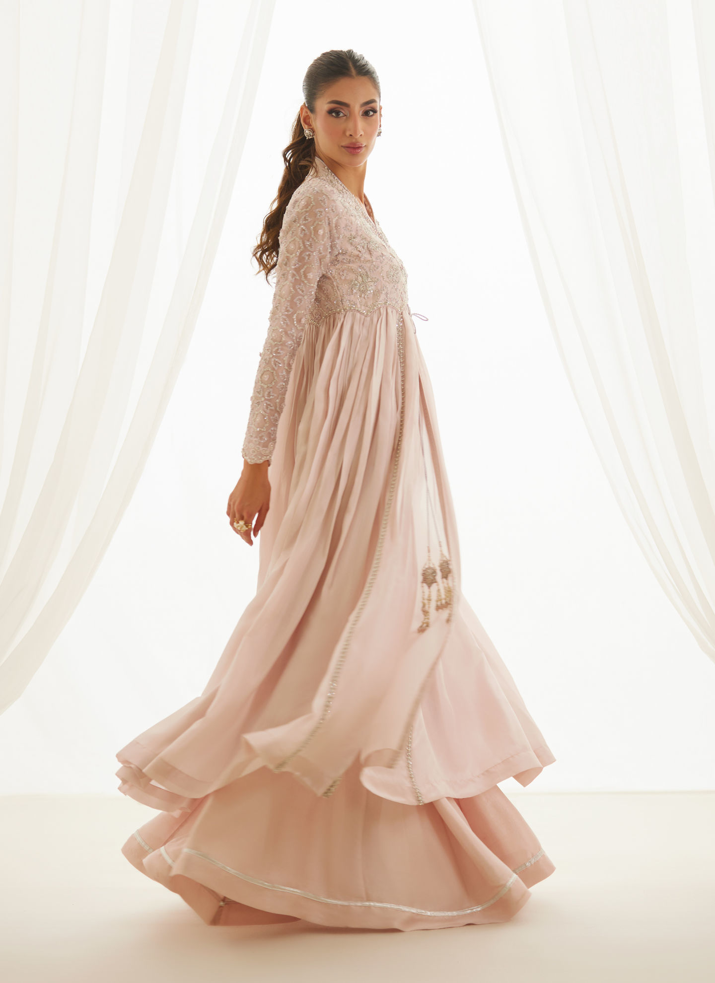 Color: Misty Pink Fabric: Kalidaar: Pure Raw Silk With Hand Embellishments, Optional Pairing: Coordinating Lehnga