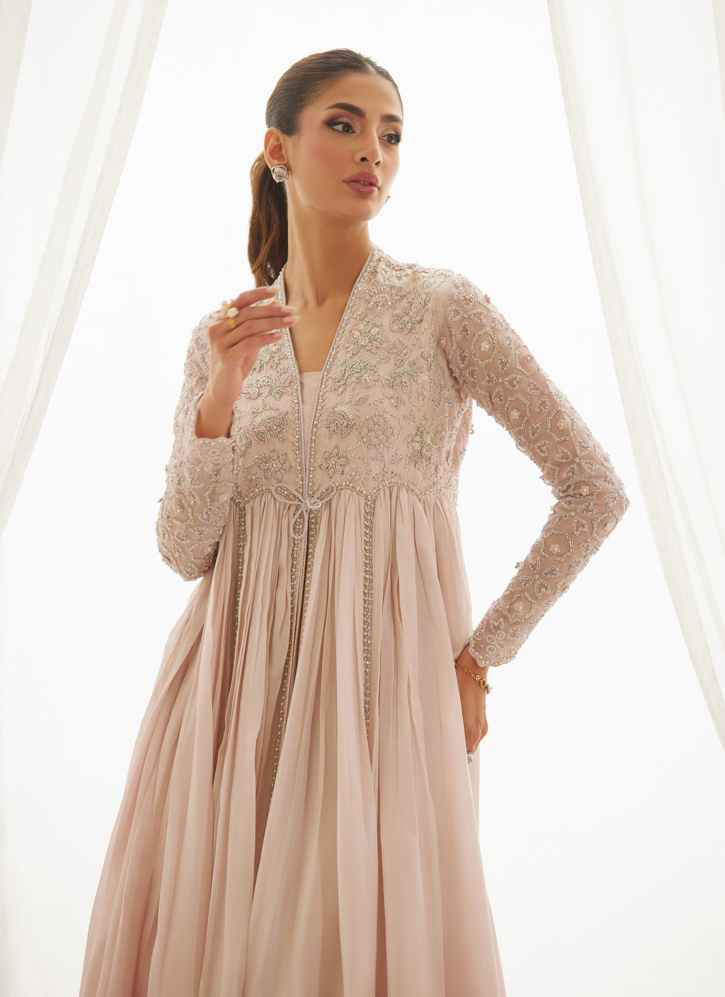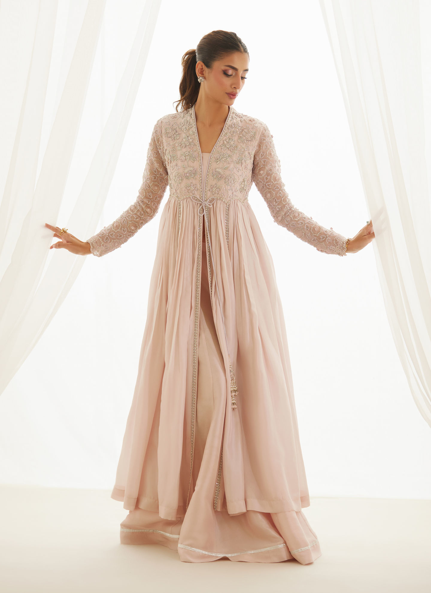 Endlessly chic and undeniably glamorous, this kalidaar is your ultimate style solution. Cut from pure raw silk in a pale blush pink, the flowing silhouette is brought to life with delicate coordinating threadwork and silver, pearl, and bead embellishments. The intricately handworked bodice is designed to command attention, making it the ultimate statement for day or night. Paired with a striking lehenga, this fail-safe ensemble promises to make you the belle of the ball.