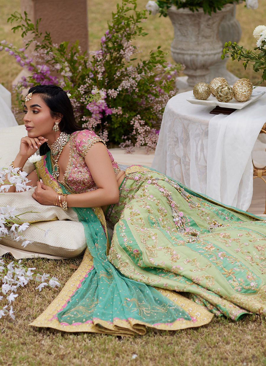 A symphony of color and craft, this lehenga choli is designed to captivate. The soft pink jamawar choli is adorned with intricate handwork and shimmering embellishments, lifted with refreshing appliqués in mint blue and green. Flowing beneath, the lehenga glimmers in three harmonious tones — mint green, dhani green, and pale mint blue — each panel layered with appliqué, embroidery, and meticulous hand embellishment. The look is completed with a sheer net dupatta, delicately scattered with chhan and finished with an embroidered border. Elegant yet vibrant, it’s a timeless expression of artistry and modern bridal charm.