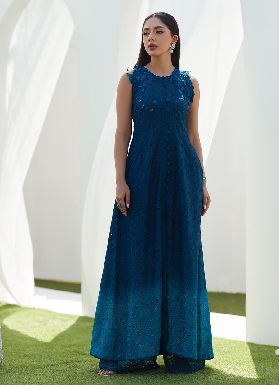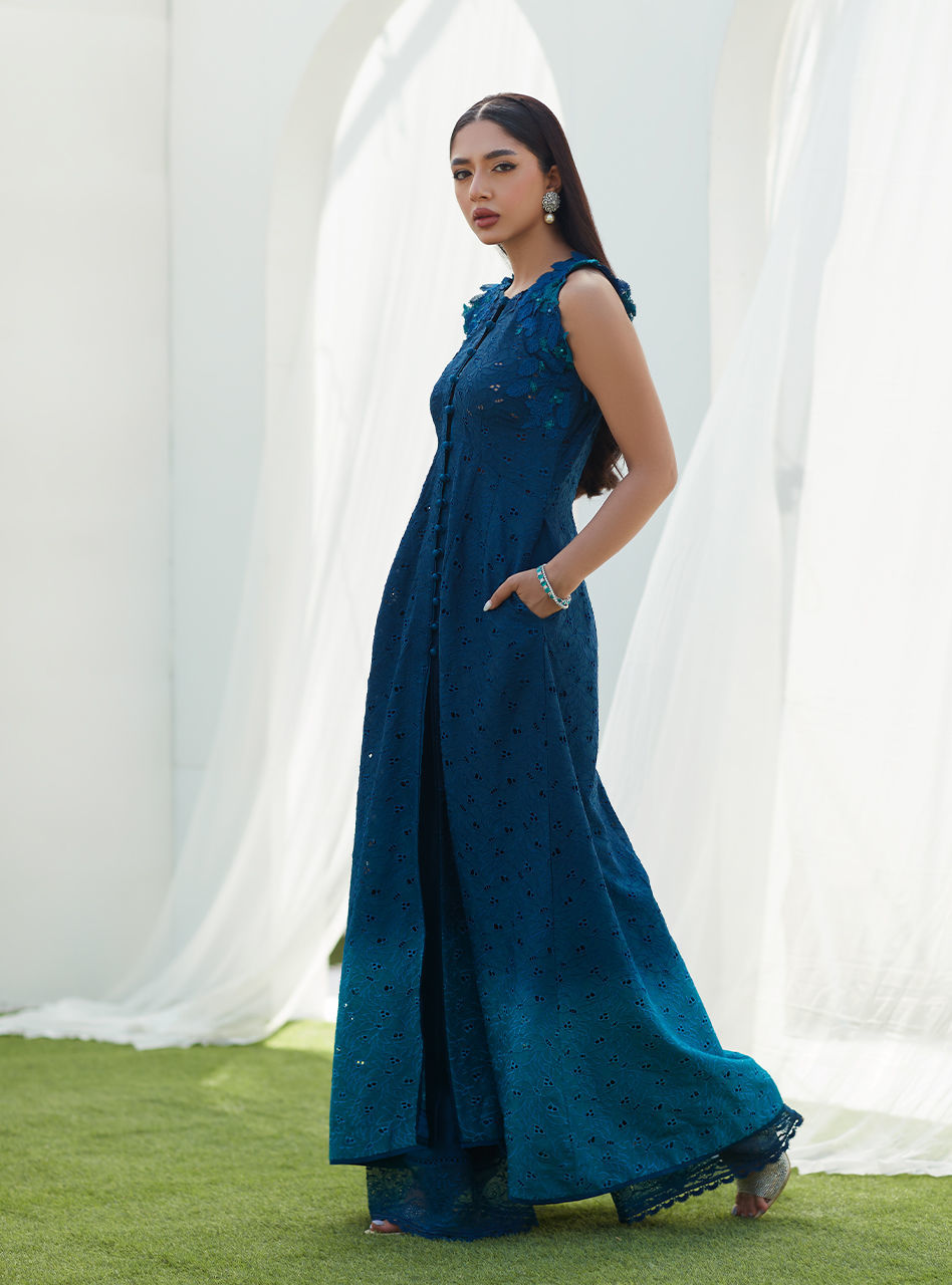 Your must-have essentials for summer festivities are finally here! A canvas of deep navy silk, smoothly flows into a striking teal hue. Cut from pure silk, Ada features a delicate trellis of delicate cutwork.
