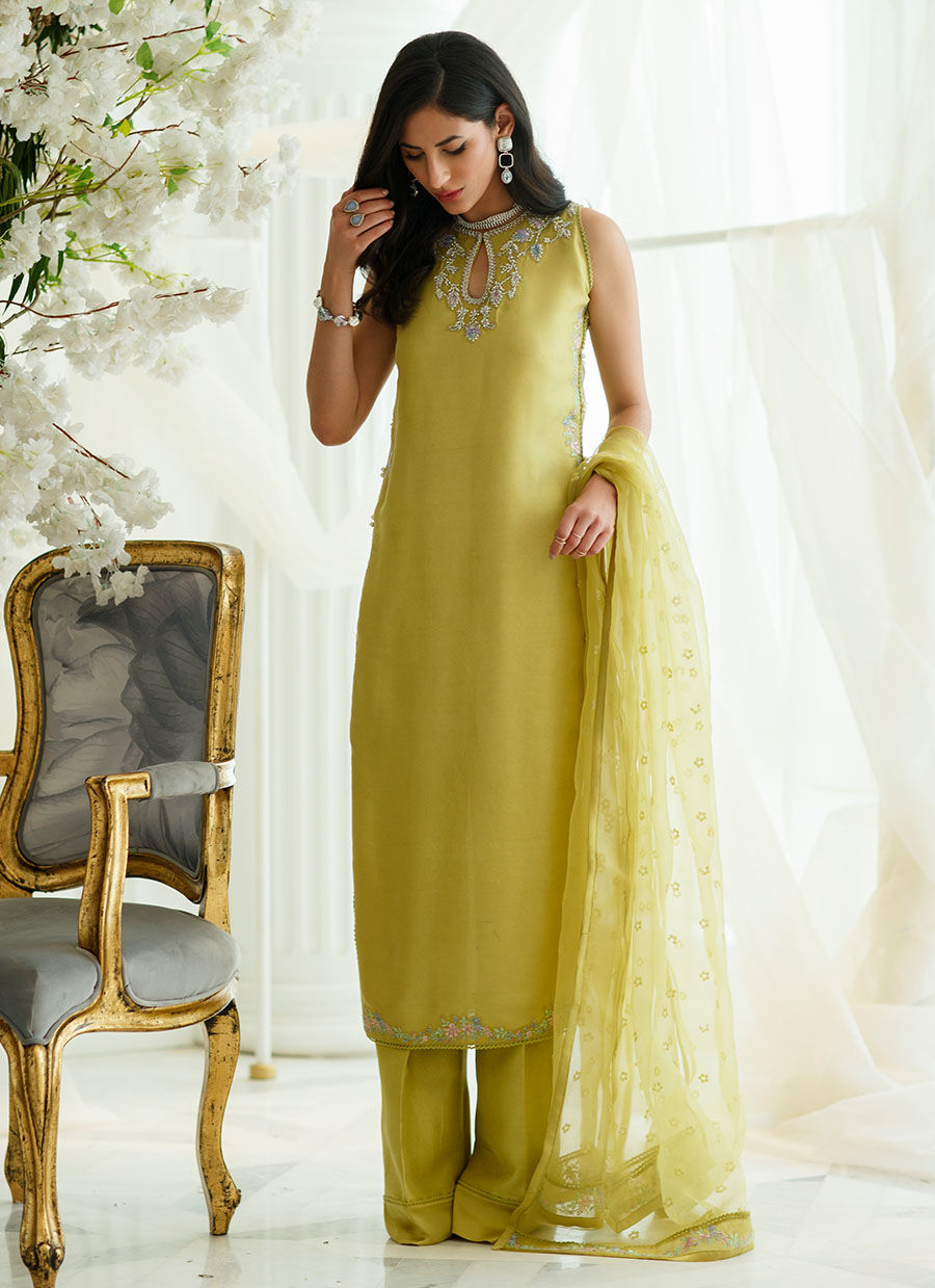 The dreamiest shade of kiwi green, is cut from pure raw silk to make a universally flattering straight column shirt. Adorned with delicately shimmering Swarovski crystals, pearls and sequins. Touches of silk thread work in pastel colours uplift and add interest to the neckline and daaman.