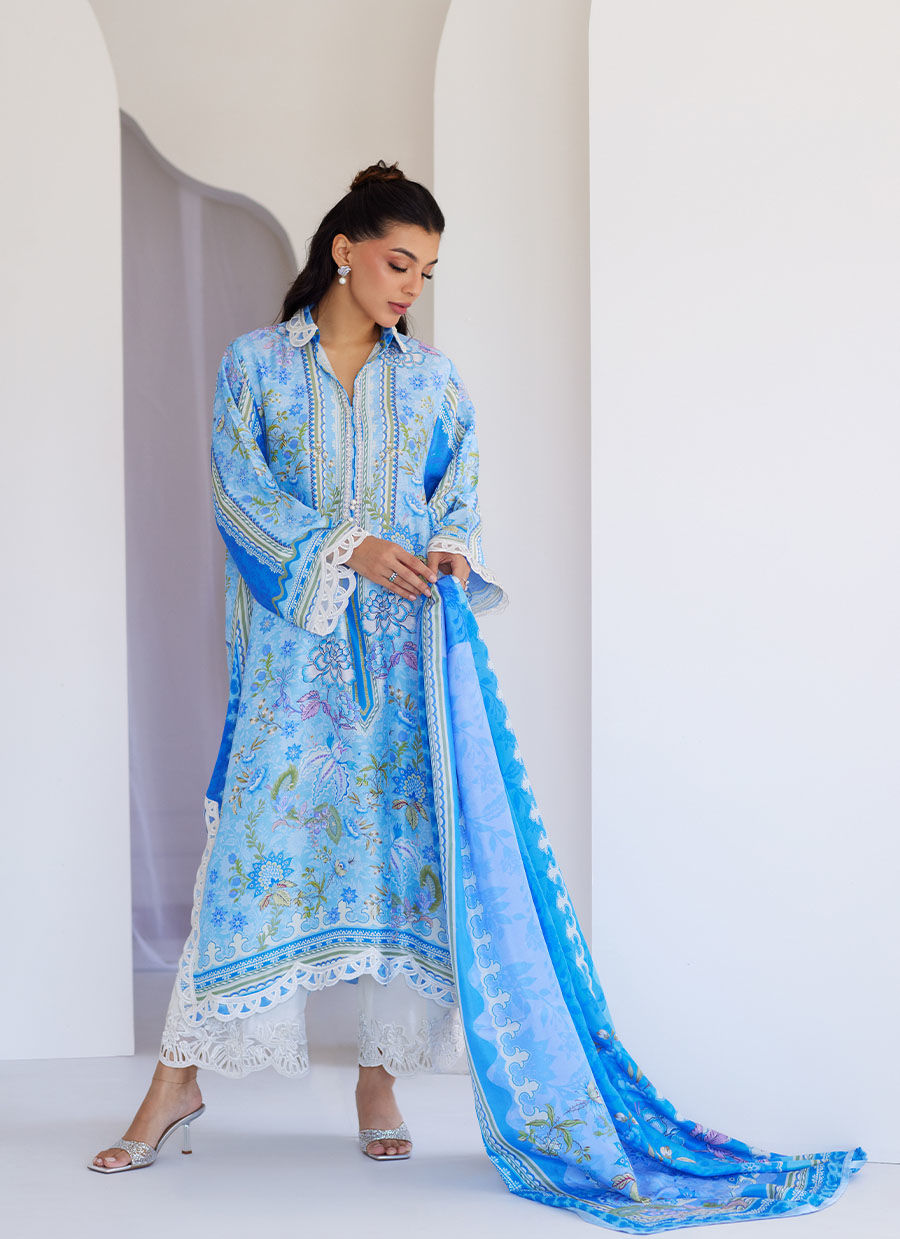 The elegant, A-line shirt is paired with a pure medium silk dupatta, digitally printed in striking shades of blue.