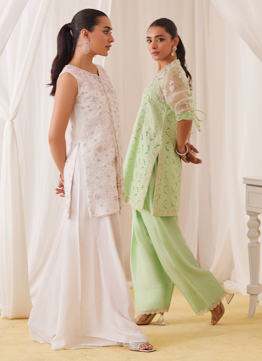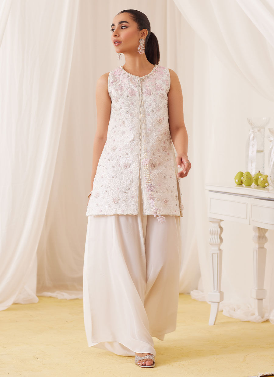 Steal the moment this season and every season that follows with the absolutely stunning Zana Pearl ensemble. Cut from intricately embroidered raw silk in a crisp time ivory, it is immaculately tailored to create a contemporary, universally flattering silhouette. The round neckline and front of the shirt are decorated with hand embellished 3D blooms, further uplifted with pearls and Swarovski crystals, to give you that irresistible lit from with-in glow!! Hand-made pearl and crystal tassels make this simply irresistible. Pair your outfit with our wide leg crepe pants (as shown) to be an instant show stopper!!
