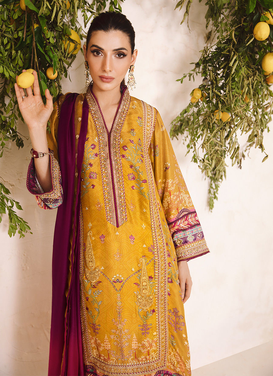 Discover elevated, refined prints created in-house with immaculate tailoring and steal the show this festive season! Tinged with the signature FTA whimsy and romance, the Zarf ensemble is impossible to resist! A canvas of stunning mustard cut from pure raw silk, is printed with uplifting florals in ivory and eye-catching shades of pink and purple.